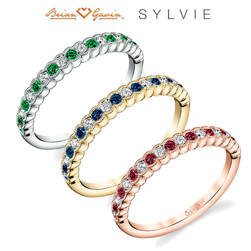 Featuring 0.30 carats of alternating H-I SI2 round brilliant bezel diamonds and gemstones surrounded by milgrain details, this stackable band is tr...