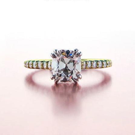 Fishtail Pave Cathedral Engagement ring 3/4 eternity ring with 4 prong double split claw prongs. Price is for setting only for diamonds up to 2 carats. Add $150 for diamonds larger than 2 carats. Please note that for ring sizes above size 8, additional fees will apply. This is due to the increase in diamonds and metal required. Please contact us for larger ring sizes. Select your center stone from our extensive online database.
